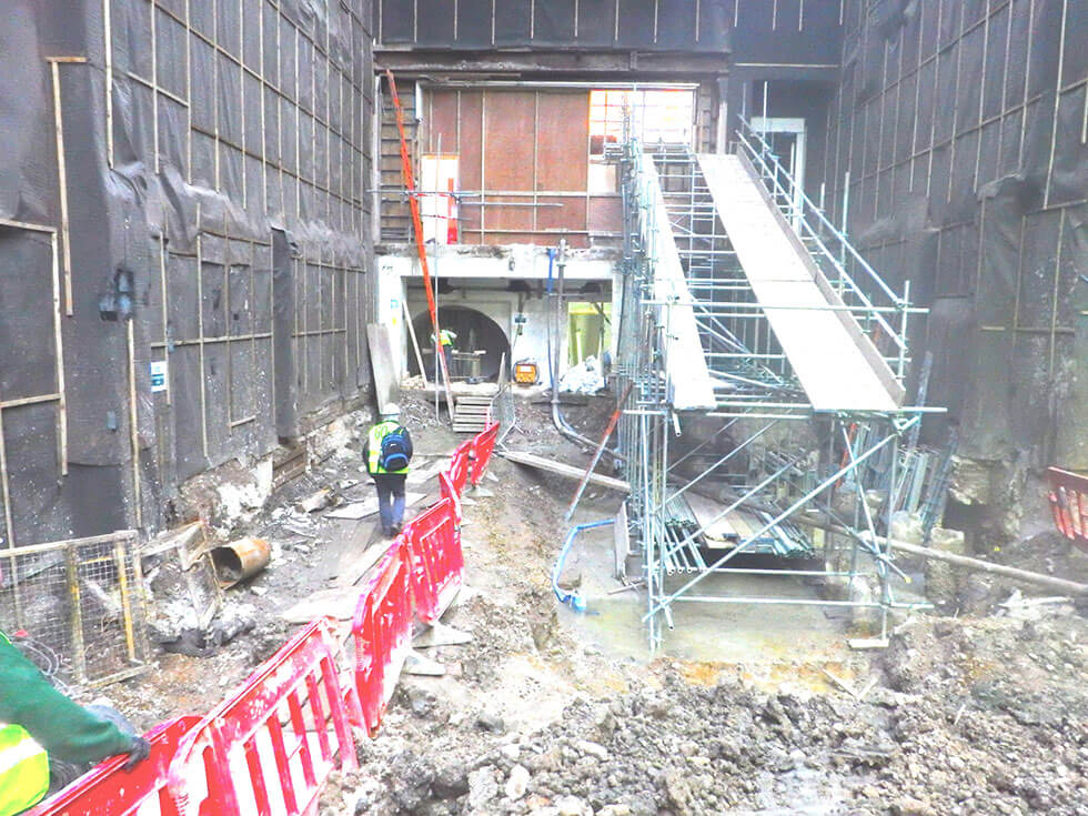 The property line construction between two existing buildings meant that there was a requirement for waterproofing both new and existing structural elements, including pile caps, underpinning, a new reinforced concrete slab, existing foundations, and also existing vaulted areas at the front of the building which extend below New Bond Street.